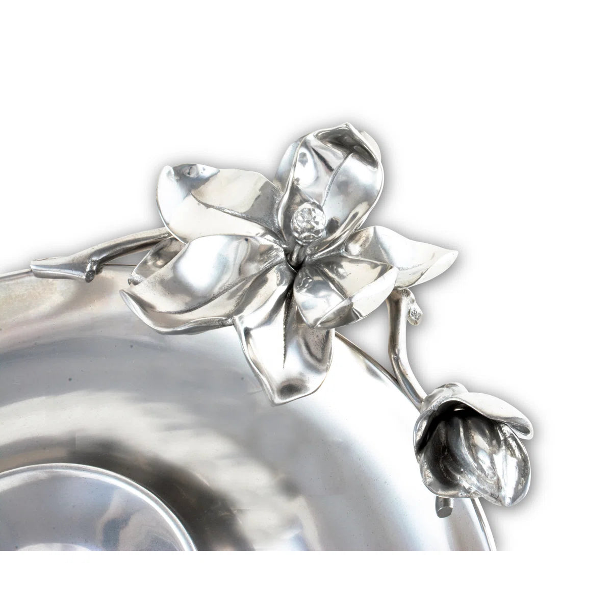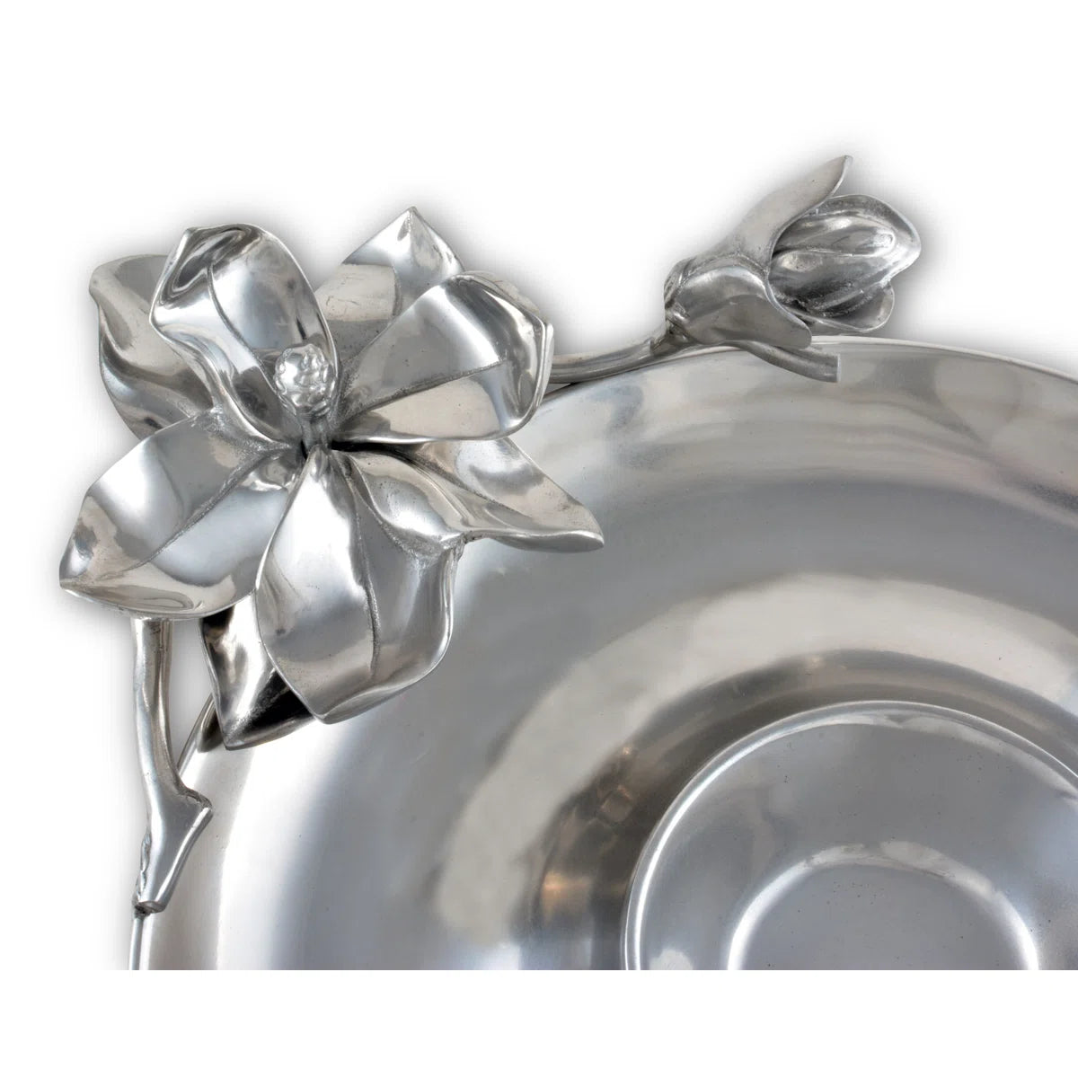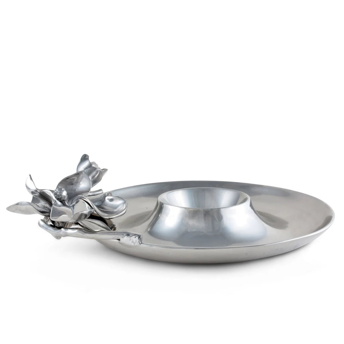 The Magnolia Chip and Dip Tray by Arthur Court Designs features a single magnolia blossom adorning a functional serving dish that is sure to garner compliments at your next get-together.