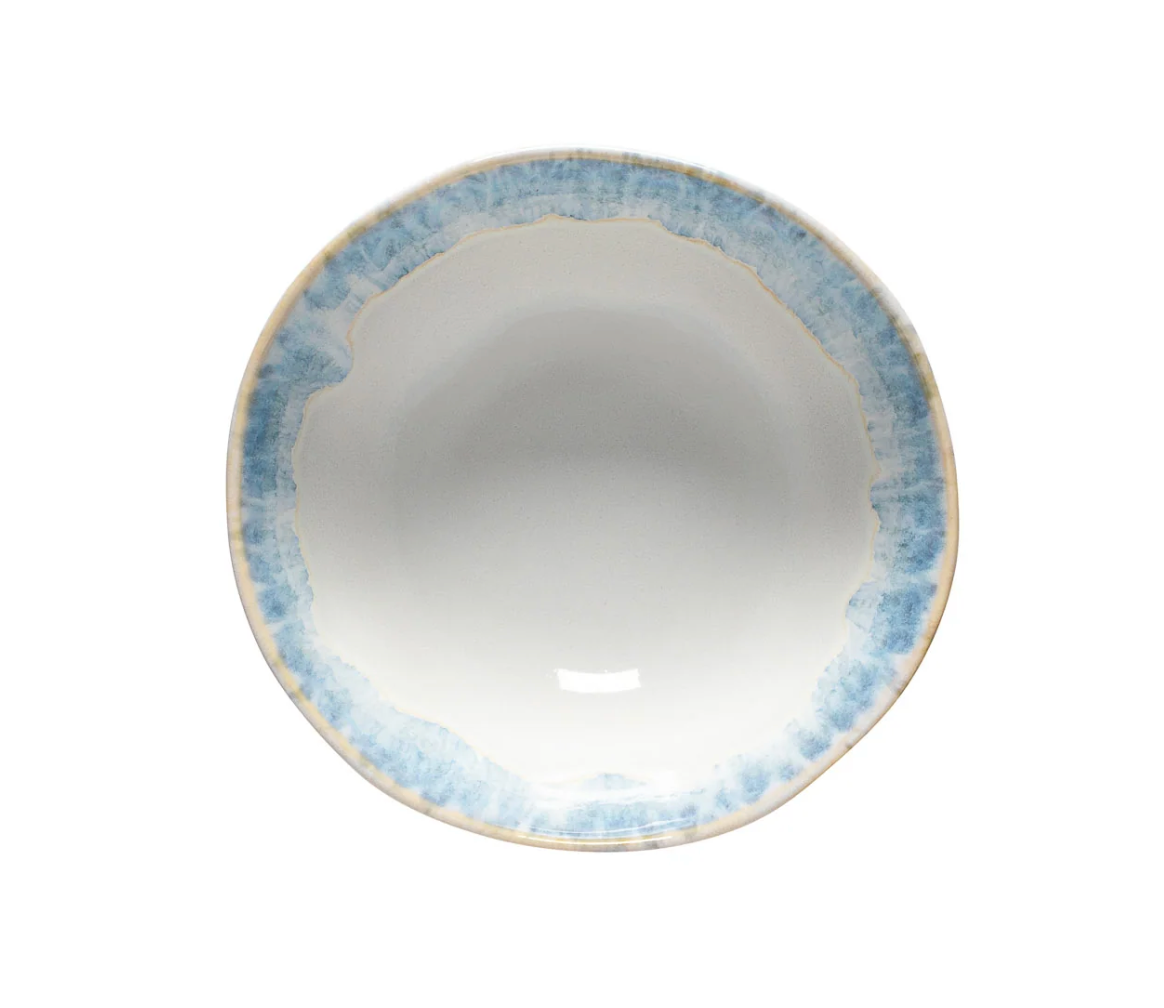 The Brisa Soup / Cereal Bowl, handcrafted in Portugal from fine stoneware, features organic shapes inspired by the Algarve Coast. Its reactive glaze in white and blue creates a unique finish, ensuring that no two pieces are alike.