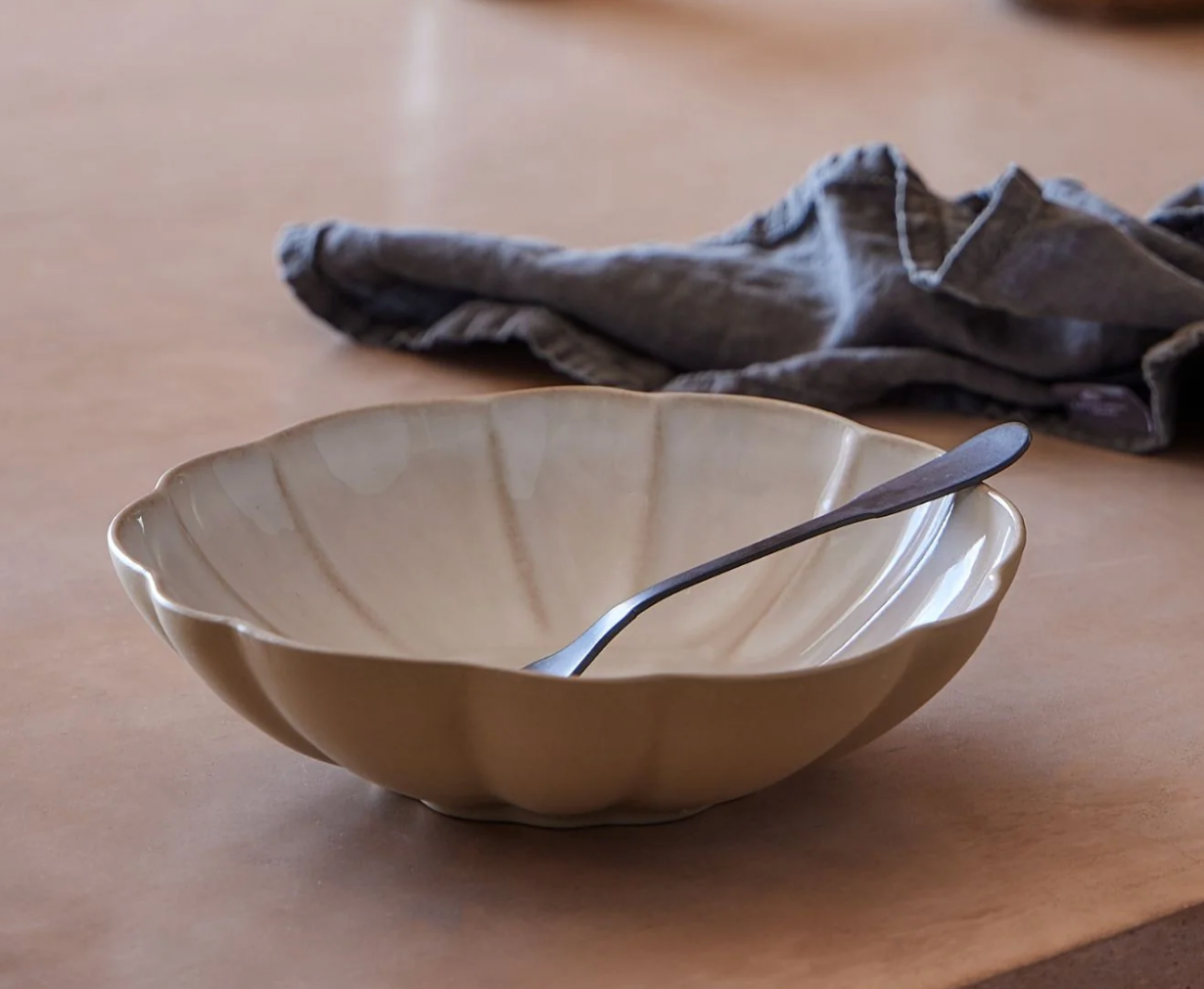The Marrakesh Soup / Pasta Plate, in Ecogres – our clay made from recycled materials. It is crafted in Portugal. Designed by French designer Christian Tortu, this collection features delicate shapes inspired by Moroccan flowers and a reactive speckled glaze that evokes the vibrant colors of Marrakesh markets and the Majorelle Gardens.