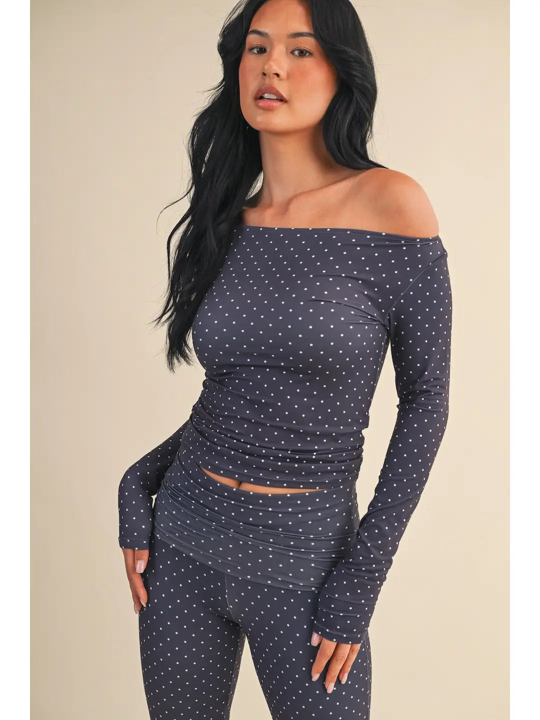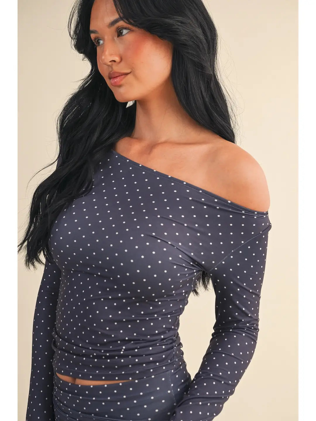 Soft knit jersey off-the-shoulder, form-fitting long-sleeve in a playful polka dot print.