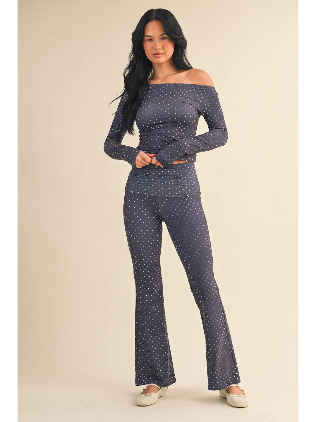 This pairs perfectly with our Polka Dot Print Soft Knit Jersey Foldover Flare Pants.