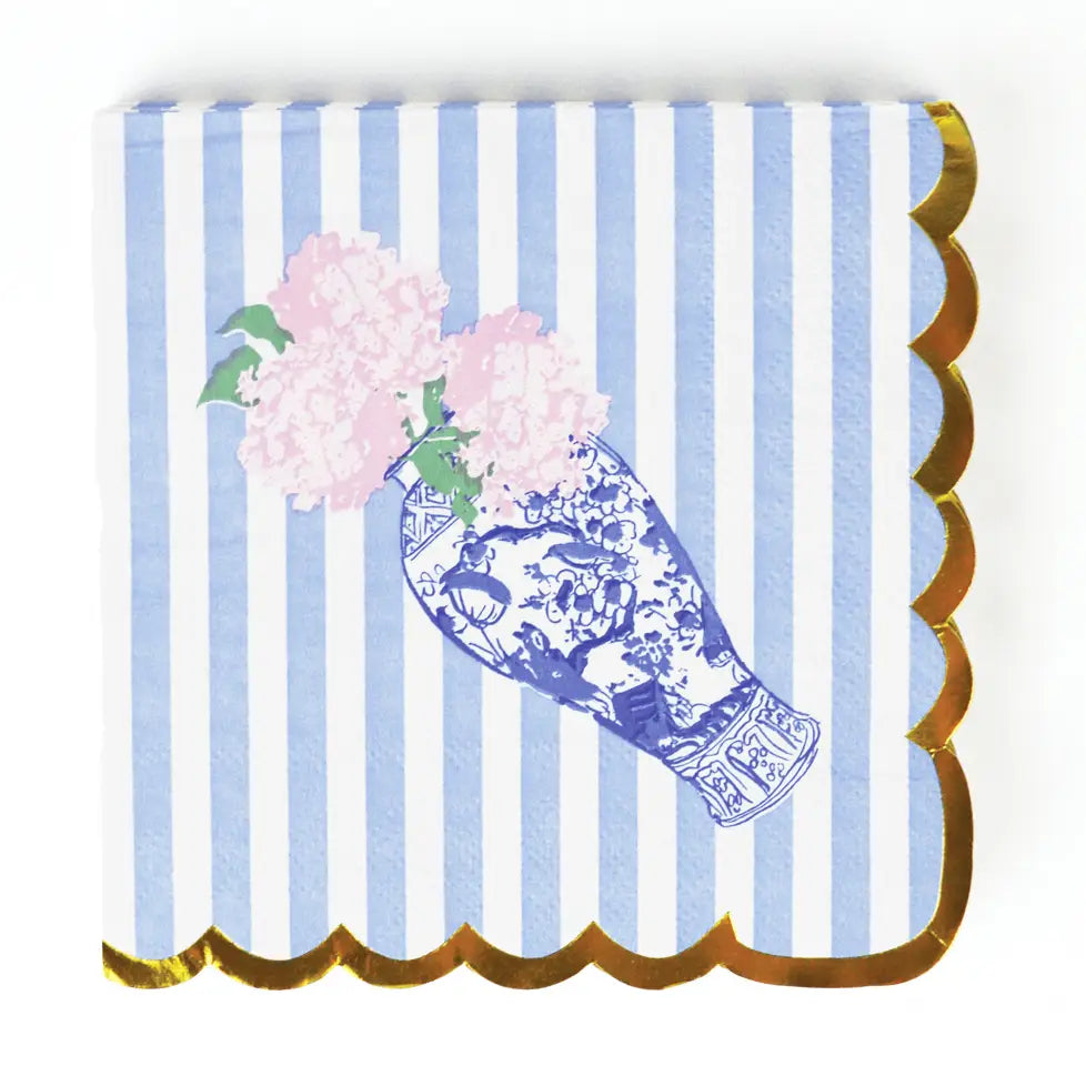 Add elegance and charm to your table with our Blue Stripe & Ginger Jar Beverage Napkins. Each pack includes 16 single-use napkins, perfectly sized for cocktails, beverages, or small bites, combining practicality with sophisticated style for any gathering. Each napkin features a classic blue stripe print, topped with a detailed ginger jar vase overflowing with blooming roses, creating a refined and timeless design. A coordinating gold foil scalloped edge adds a polished, festive touch, elevating the overall presentation of your tabletop. Perfect for dinner parties, bridal showers, or casual entertaining, these napkins bring charm, sophistication, and a touch of floral beauty to every setting. Their reusable aesthetic as a disposable option makes them an effortless way to add style without extra cleanup. Compact, stylish, and beautifully designed, this 16-pack of beverage napkins transforms any gathering into a thoughtful and elegant experience, making every detail of your table setting feel carefully curated. 5.5" x 5.5"