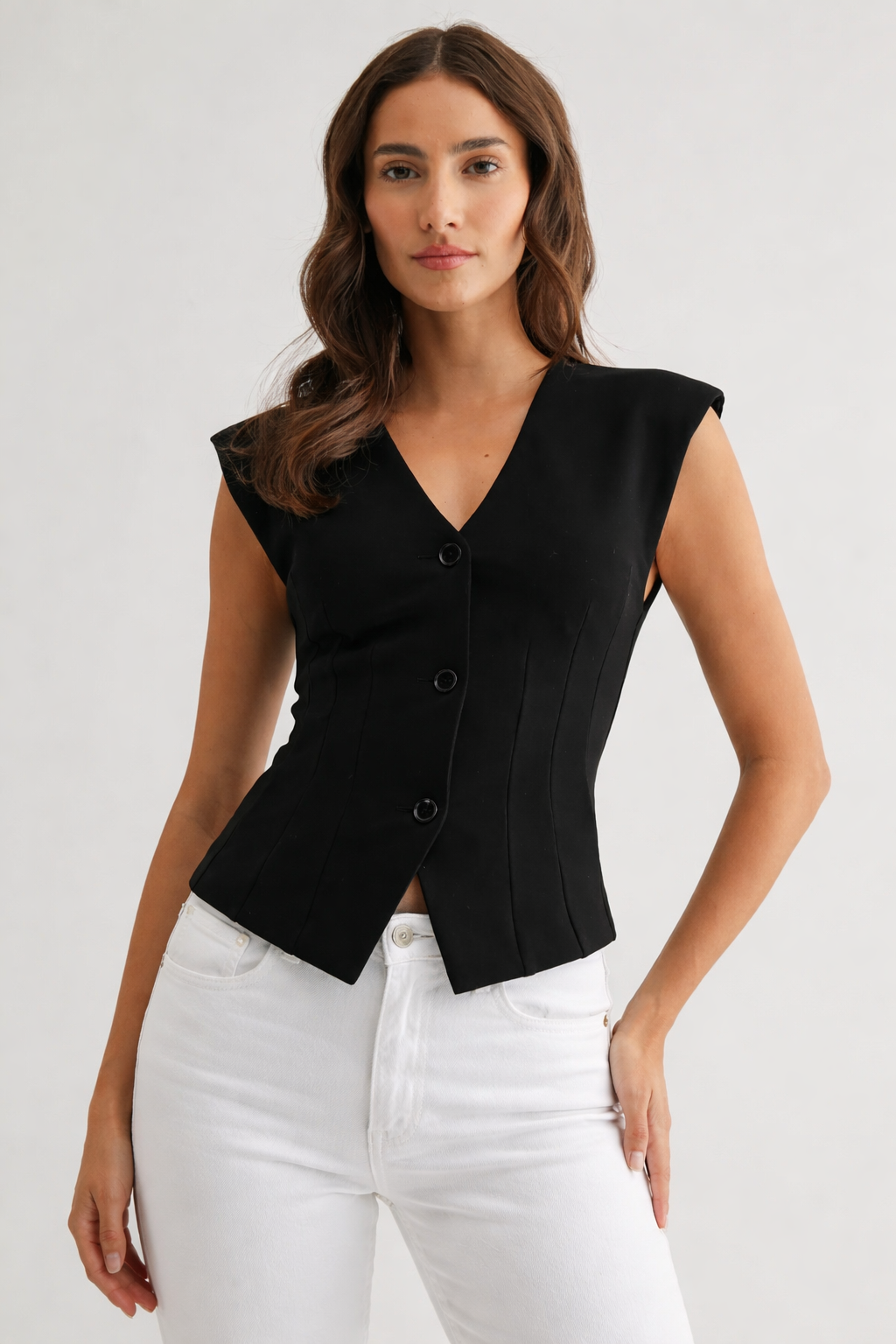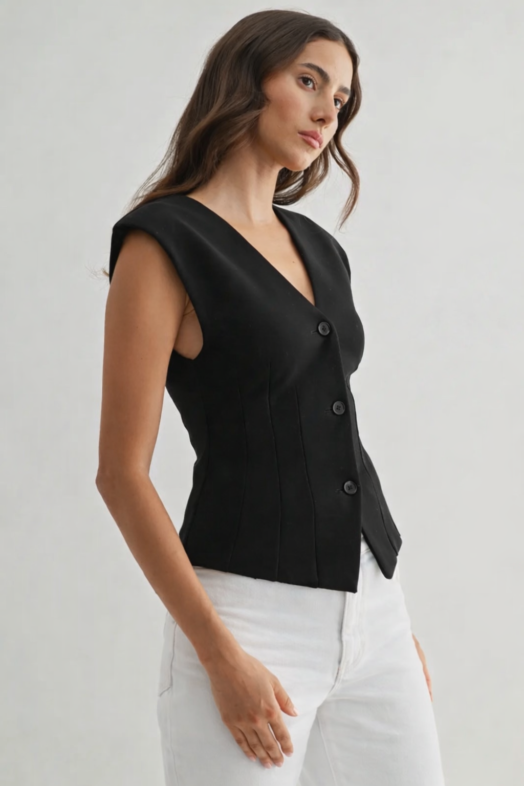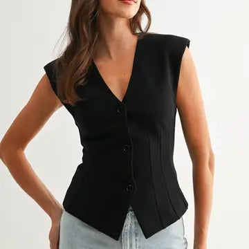 This women's structured black vest delivers a sophisticated, modern silhouette, suitable for professional environments and high-end casual settings. The design offers clean lines, a precise fit, and a versatile style, making it a relevant addition to a contemporary corporate wardrobe.