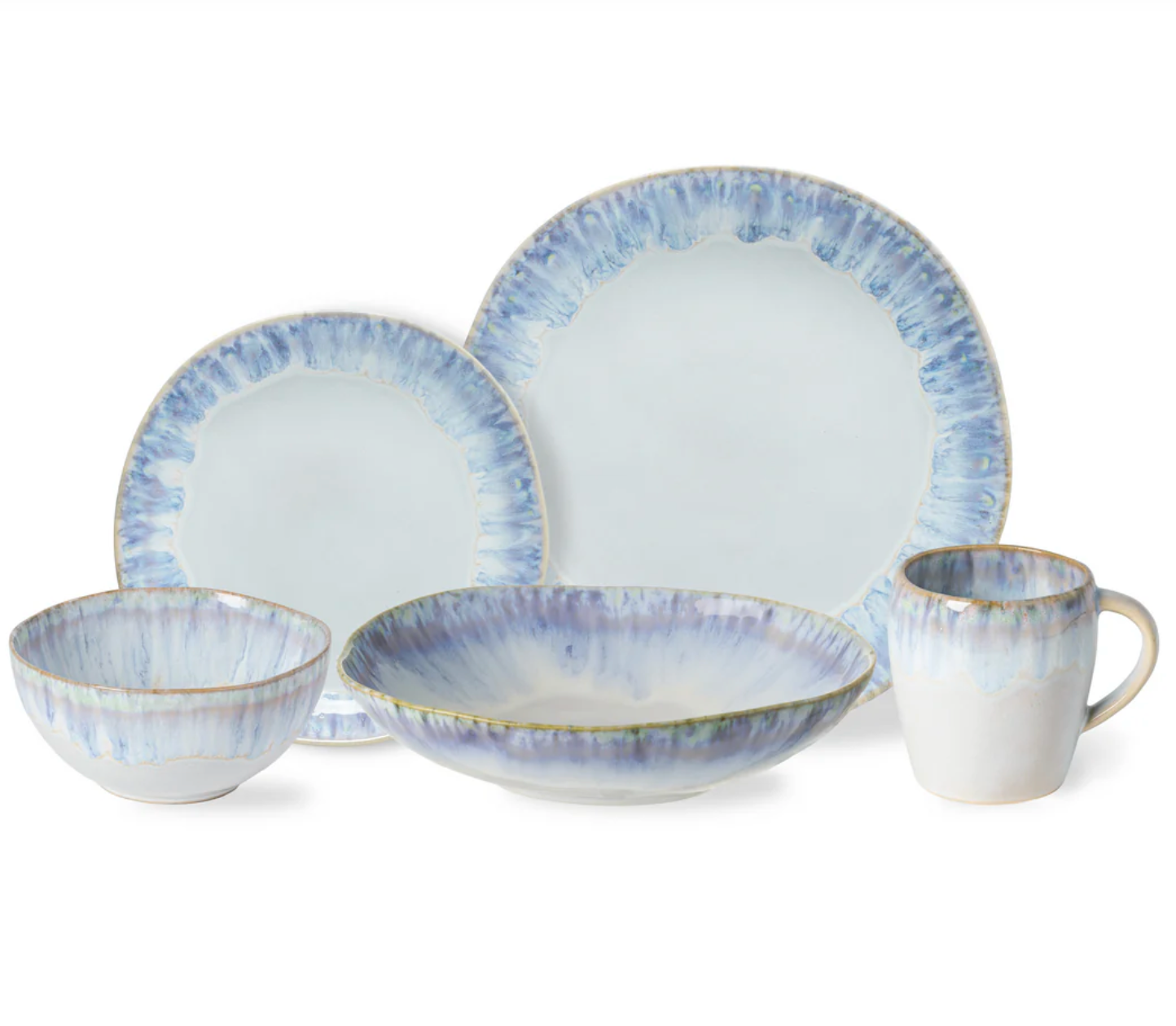 The warm breeze that blows from the east and cascades along the Algarve coast with fruity aromas and the fresh flavors of Ria Formosa was the inspiration for this collection. The blended white and blue glazes and organic shapes transport us to the intricate landscape of lagoons, canals, salt works, and sandy beaches stretching across deserted islands. This collection adds light to every gathering and turns any table into a memorable experience.