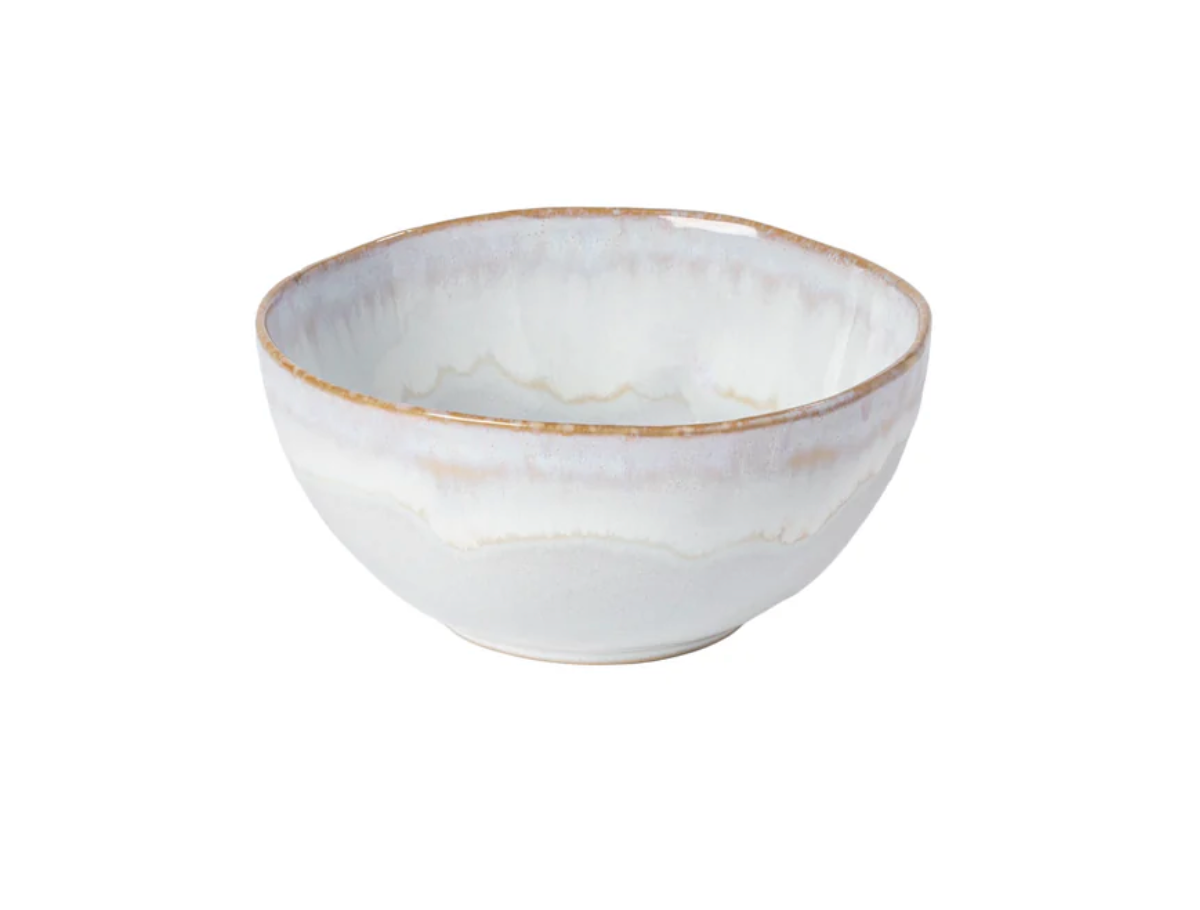 The Soup / Cereal Bowl, handcrafted in Portugal from fine stoneware, features organic shapes inspired by the Algarve Coast. Its reactive glaze in white and blue creates a unique finish, making it perfect for special occasions or daily use.