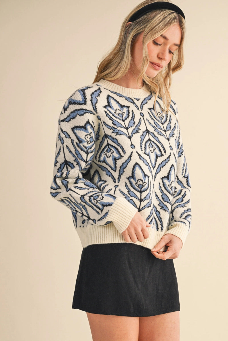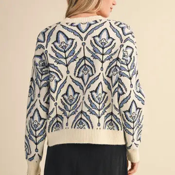 Floral pattern knit sweater. Ribbed round neckline, hem, and cuffs. All-over floral knit. Relaxed fit pullover.