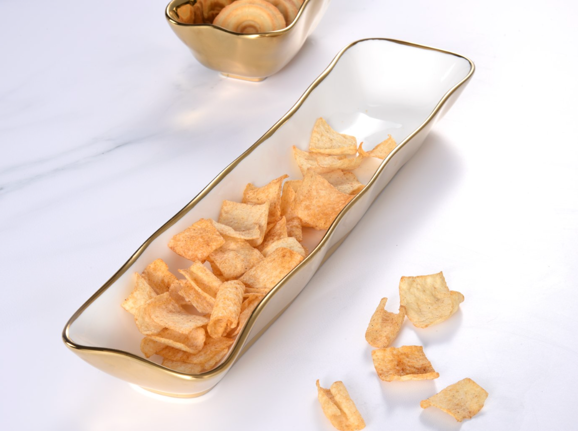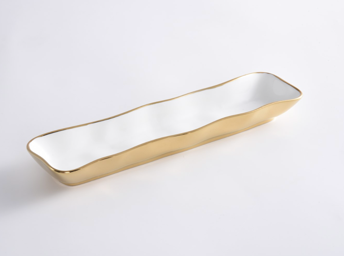 Cracker Tray from our Moonlight Collection. Perfect for crackers, small cookies, and other small treats. Crafted in a stunning white high-fired porcelain with gold titanium. Food safe, dishwasher safe, oven safe to 500°. Easy Care.