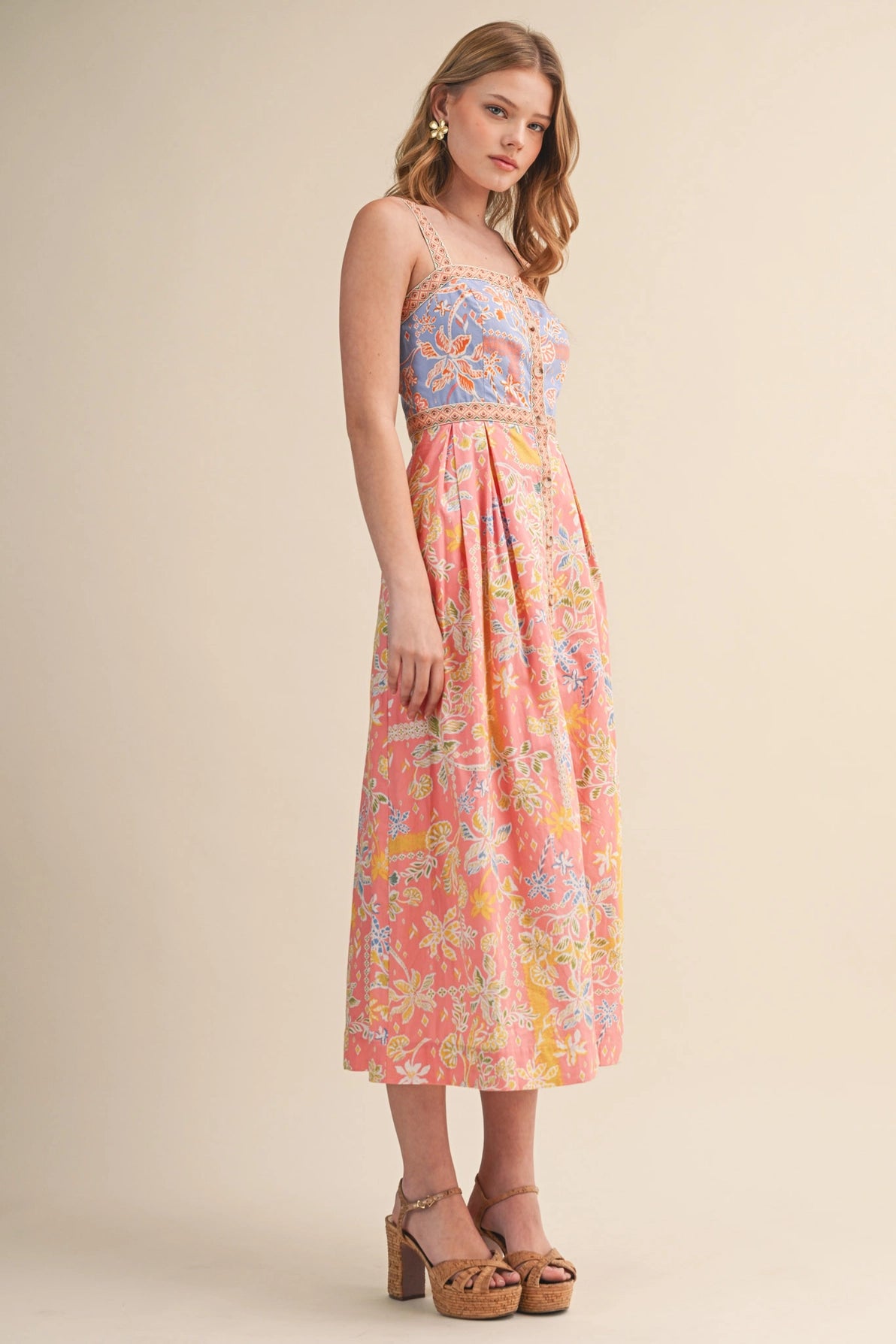 &Merci Floral Button Down Tape Trim Midi Dress