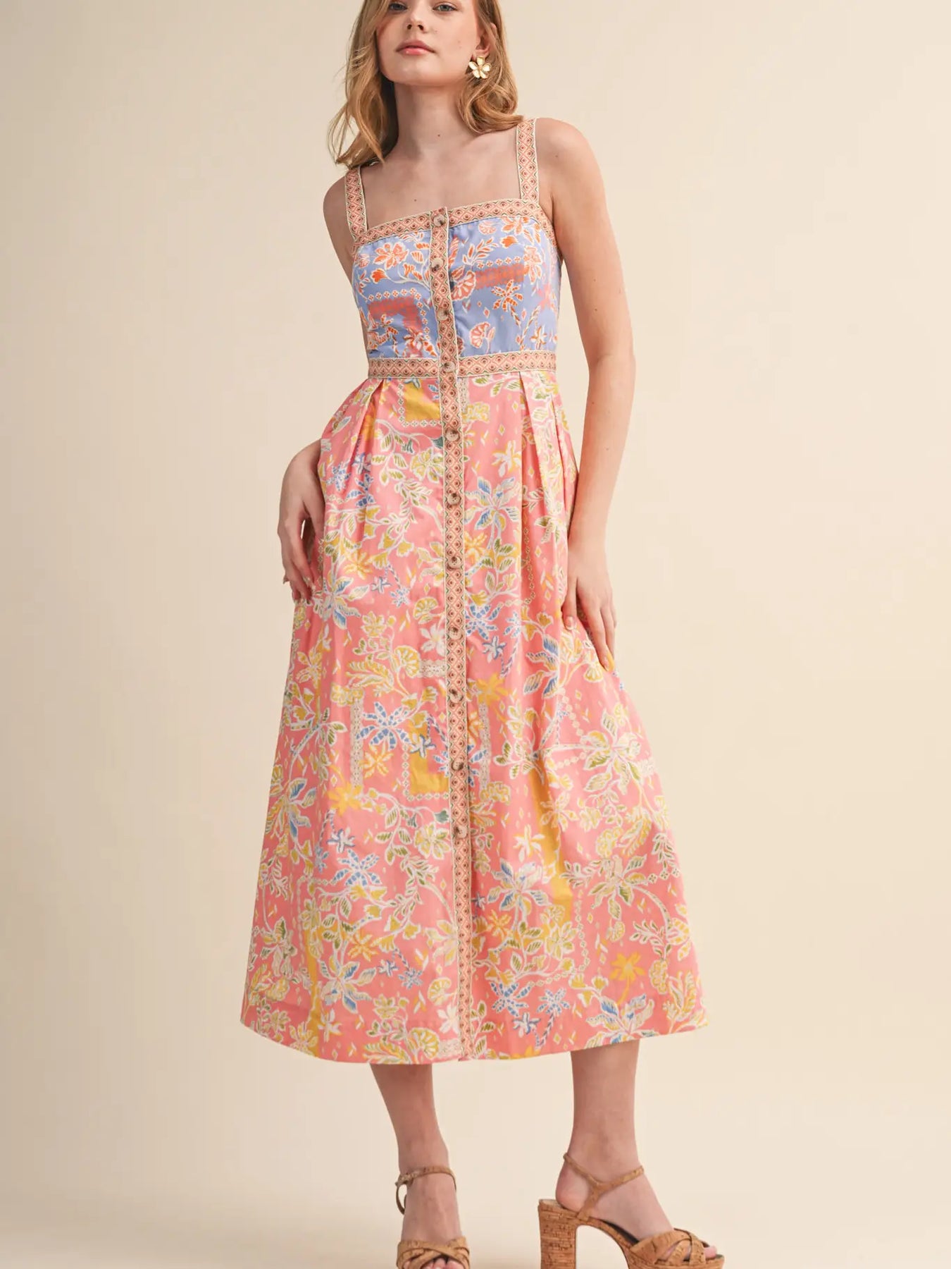 Button down tape trim midi dress with a square neckline, fitted waist, smocked elastic back, tape trim on straps, neckline, button placket, and waist. This dress has pockets, and is lined.