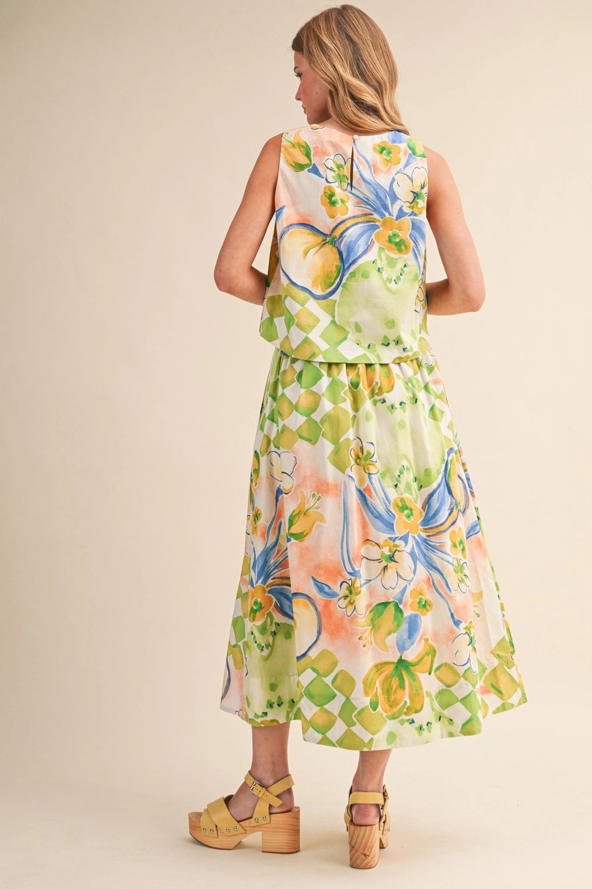 This floral cropped tank has a round neckline, keyhole back with button closure, and a semi-cropped bodice.