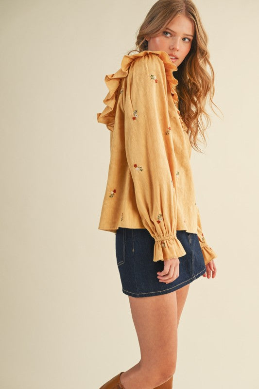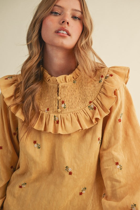 &Merci Ruffled Smocked Yoke Embroidered Blouse