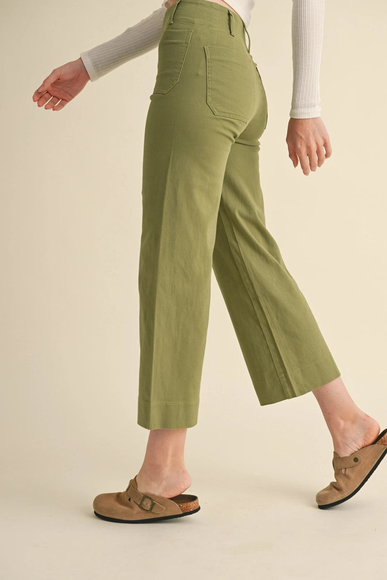 Create an effortlessly laidback look with these cropped wide leg pants! Stretchy and sturdy fabric shapes these ultra cool pants that have a high-waisted fit with a zipper and button closure. The wide legs have front and back patch pockets to add a utility element. Pants end at cropped length.
