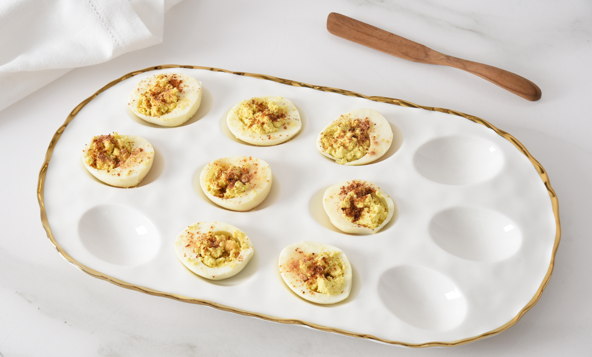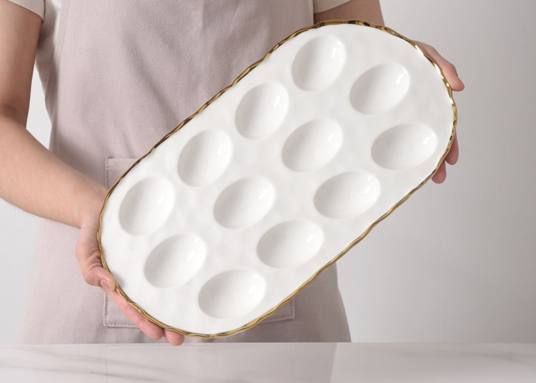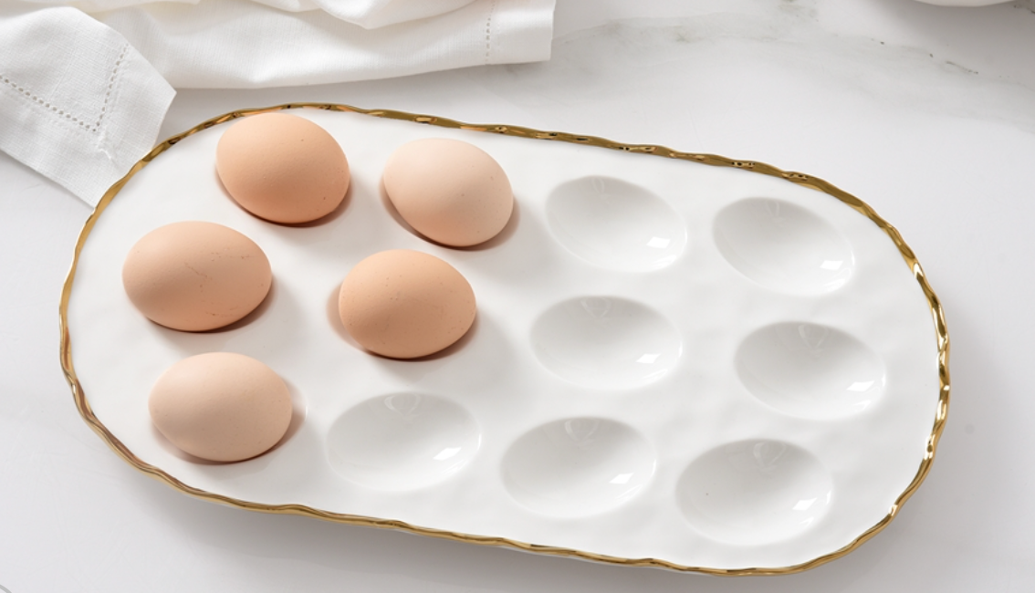 Oval Deviled Egg Tray from our Portofino Collection. The perfect accompaniment to relaxed weekend brunches, annual Easter celebrations or a fun night in, our egg tray is a great centerpiece for more than just eggs! Use to display a dozen deviled eggs at brunch or your beautifully decorated Easter eggs. This tray also makes for a great sushi display for a fun night in. Chill in the refrigerator first to keep food fresh and tasty when served. Gorgeous white porcelain with a delicate gold trim. Dishwasher safe, stain resistant, tarnish free, oven safe. Tarnish and stain-free. Easy Care.