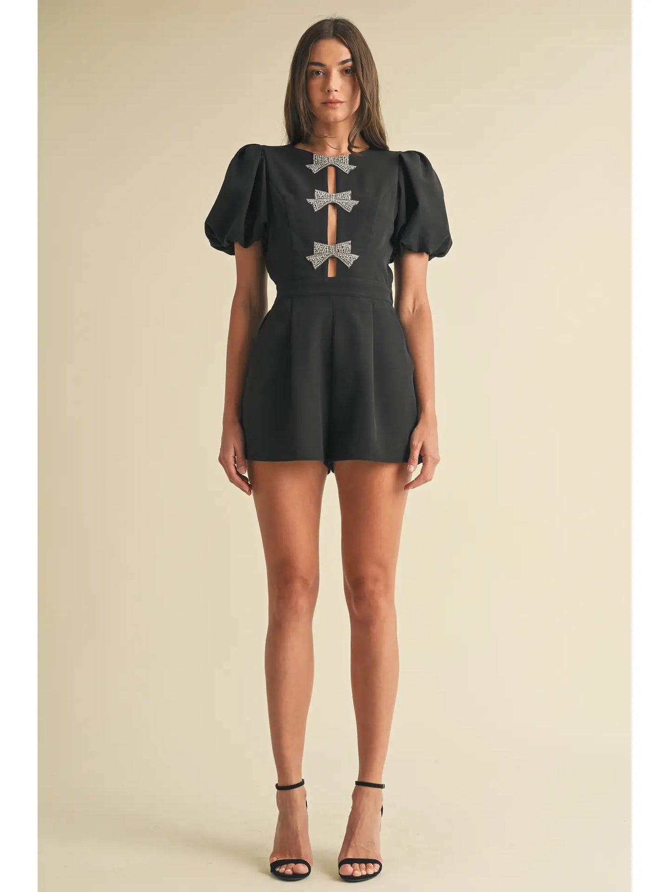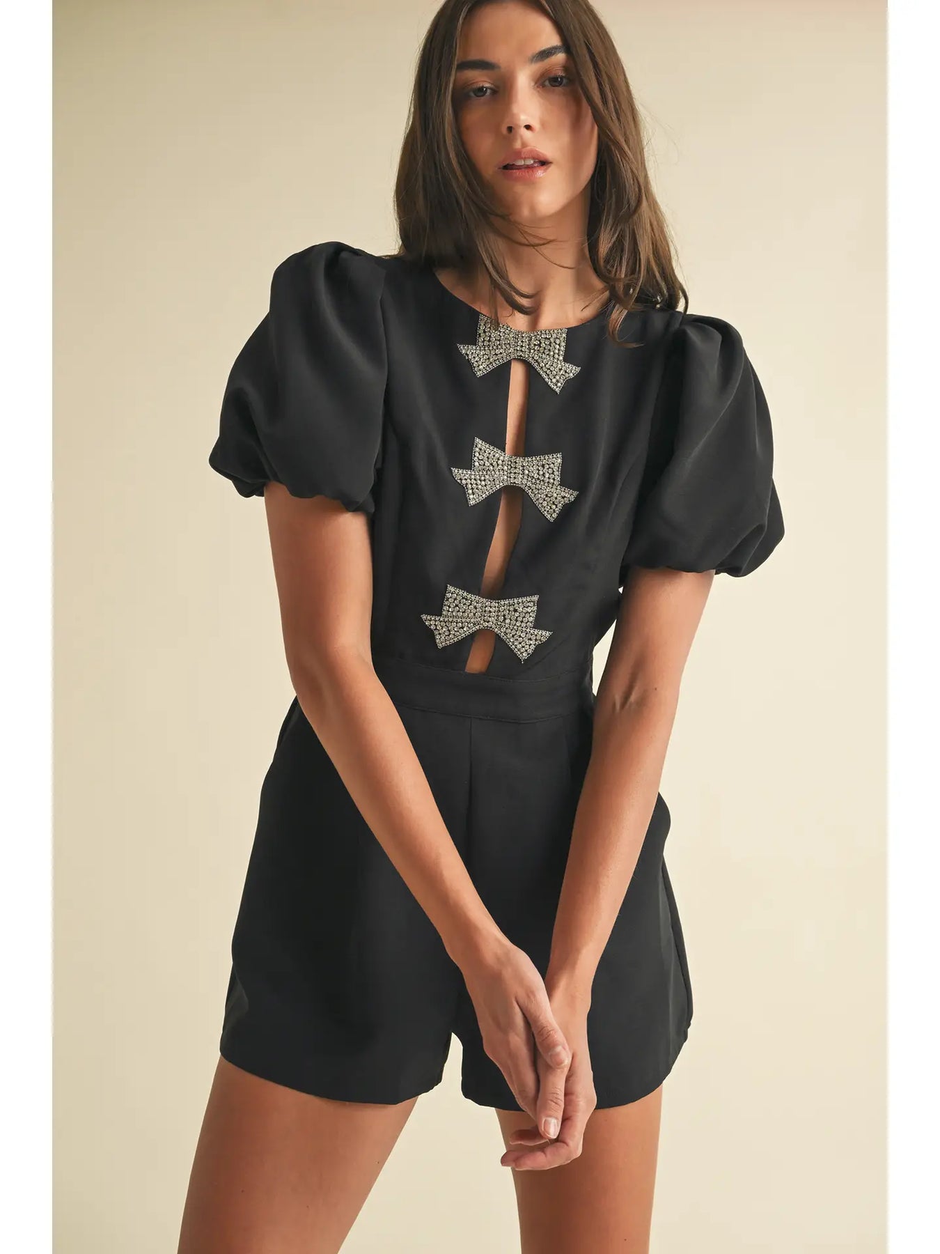 Turn heads in this ultra-feminine white romper, featuring dramatic puff sleeves and eye-catching rhinestone bow accents. The structured silhouette is balanced by a playful front cut-out detail, giving it the perfect mix of sweet and statement-making. Ideal for bridal events, birthdays, or any moment that calls for a little sparkle.