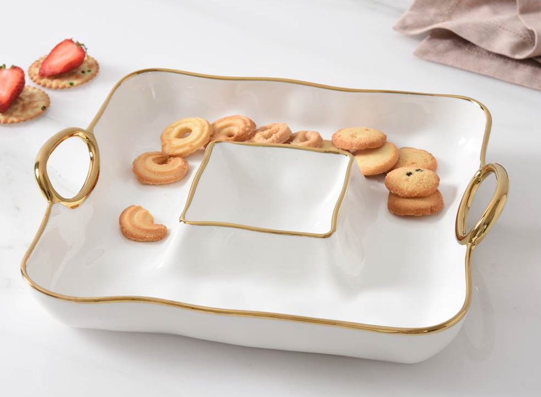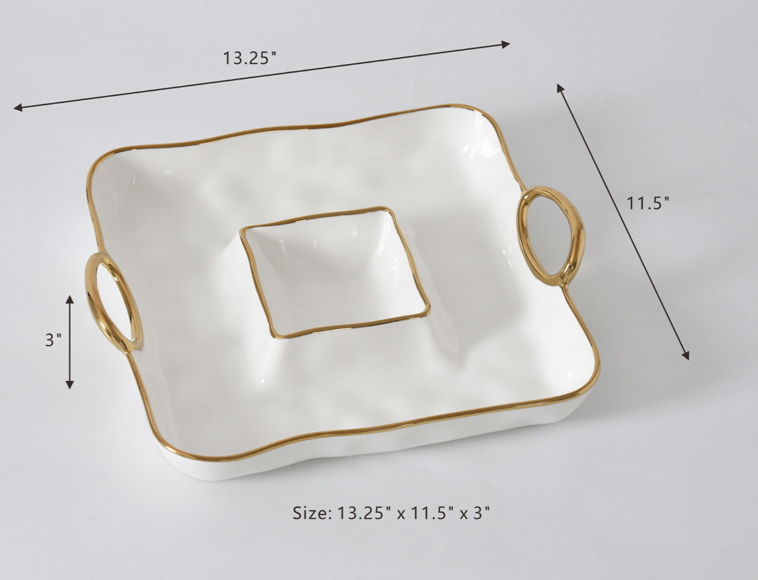 Square Chip & Dip from our Golden Handles. Perfect for any dip combo: hummus and pita, salsa and tortilla chips, veggies and ranch or our favorite berries and whipped cream! Gleaming white porcelain with smooth and graceful rim and handles in gold. Food safe. Dishwasher safe. Oven safe to 500°F/260°C. Easy Care.